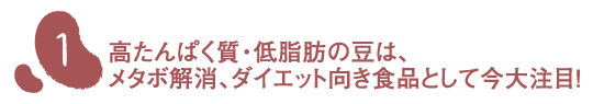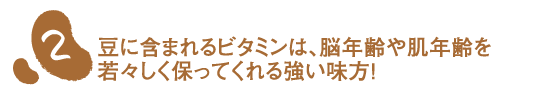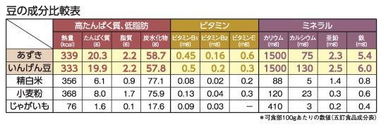 あずきやいんげん豆には人体に不足しがちなビタミンB群やビタミンEが含まれています。その中でもビタミンB1は、体内で糖質が分解され、エネルギーに換わる時に欠かせない栄養素。しかも疲労を回復するだけでなく、皮膚に抵抗力がつき、美肌を保ちます。また「発育ビタミン」と呼ばれるビタミンB2は脂質や炭水化物代謝を促し、皮膚や爪、頭髪の健康維持に必要不可欠な栄養素です。ビタミンEは「老化防止のビタミン」と呼ばれ、その抗酸化作用により体内の脂質が酸化してしまうのを防ぎ、細胞の健康維持を助けてくれるんです。こうした豆に含まれるビタミンは、脳年齢や肌年齢を若々しく保ってくれる強い味方なんですね。 |