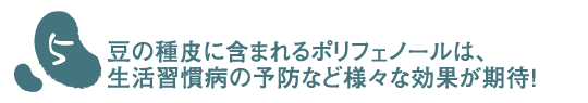 体内に取り込まれた酸素は、代謝やストレスによって「活性酸素」という不安定な物質に換わり、体内の脂質を酸化させたり、たんぱく質を変性させたりして、身体を錆びつかせてしまうことがあります。植物等に含まれるポリフェノールには強い抗酸化作用があり、このような活性酸素の悪影響を軽減する効果が知られています。豆には種類によって種皮に様々な模様や色が付いていますが、この色成分にはポリフェノールが含まれていて、特に色豆と呼ばれるあずきや金時豆などは高濃度で、抗酸化作用を促すことが最近の研究で報告されています。このようなポリフェノールを含む食品を積極的に食べることで、動脈硬化や心臓病の予防、抗アレルギー、免疫増強、生活習慣病の予防など様々な効果が期待できるんです! |