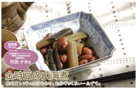 | 3. | 鍋にサラダ油を熱し、フキと昆布を加えて炒める。昆布のつけ汁を加えて15分ほど煮、金時豆を加える。 |