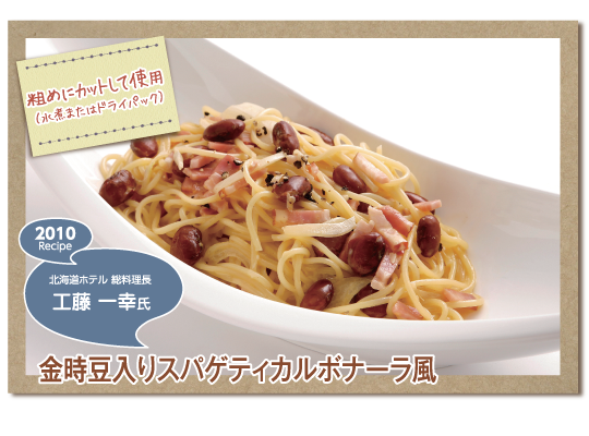| 4. | フライパンにサラダ油を入れて熱し、ベーコンと玉葱を炒めます。次にスパゲッティ麺を加えて痛め、金時豆と少量の白ワインを入れて炒めます。 |