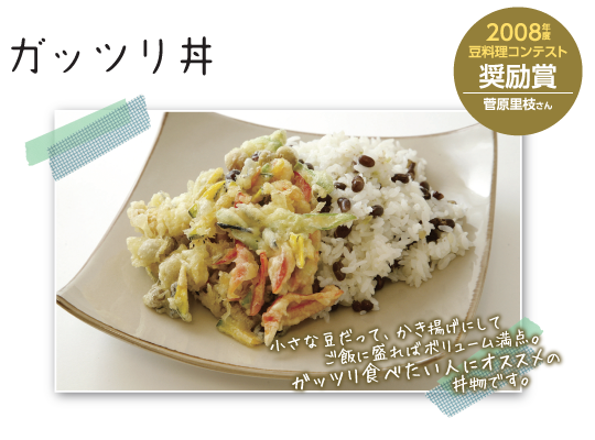 | 5. | 180℃に熱した油におたまですくって入れ、カラッと揚げる。器にご飯を盛ってからかき揚げを盛り、仕上げにわさびを溶き入れて熱々に温めたタレをかける。 |