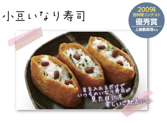 | 4. | 酢飯の中に水気を切ったあずきと大根の葉を加え、味付油揚げに詰めて出来上がり。 |