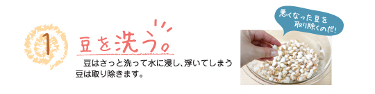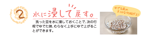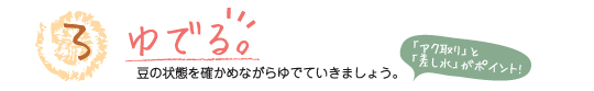| 鍋はホーロー鍋など厚手で深めのものを用意。浸しておいた水ごと鍋に入れ、水加減は豆の量に対して4〜6倍になるように入れます。 | フタはしないで強火にかけ、沸騰するまで過熱します。 | 煮立ったら、いったん豆をザルに取り、アクを含んだゆで汁を捨てます。 |