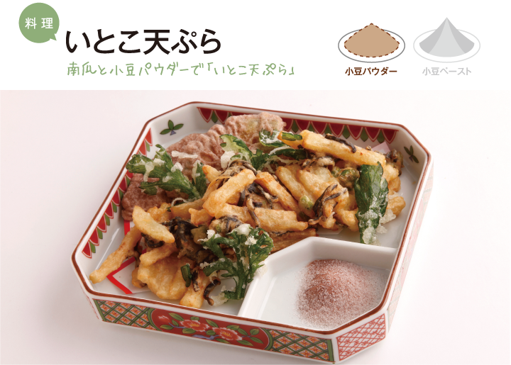 〈1〉 南瓜は食べやすく5mm幅に薄く切る。 〈2〉 じゃがいもは拍子切りにする。 〈3〉 衣は小豆パウダー ・小麦粉・水をさっくり混ぜておく。 〈4〉 南瓜を3.の衣にくぐらせ揚げる。 〈5〉 残った衣にじゃがいも・塩昆布・枝豆を入れ軽くまぜあわせ、かき揚の要領で揚げる。 〈6〉 小豆パウダーと食塩を混ぜ、添える。