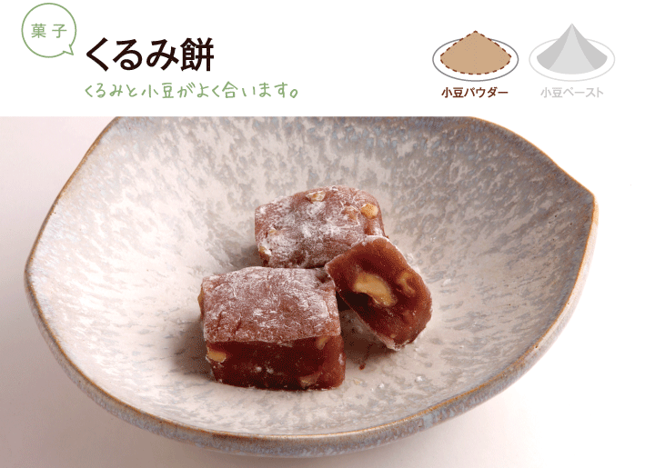 〈1〉 くるみは電子レンジ(600W)で1分加熱し、ほぐしておく。 〈2〉 耐熱の容器に上新粉・白玉粉・小豆パウダー・水を入れよく混ぜる。 〈3〉 2.を電子レンジで3分加熱する。(1回目) 〈4〉 3.を取り出し、ヘラでよく混ぜる。 〈5〉 4.を電子レンジで3分加熱する。(2回目)。 〈6〉 5.を取り出し、1.のくるみを加えよく混ぜる。 〈7〉 6.を電子レンジで3分加熱する。(3回目) 〈8〉 7.を取り出し、ヘラでよく混ぜる。 〈9〉 8.をバットに広げあら熱を取る。 〈10〉 9.が冷めたら全体的に片栗粉をまぶし食べやすい大きさに切る。