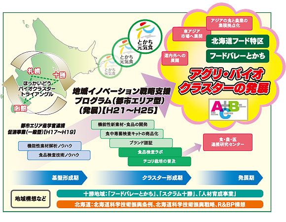 十勝エリアでは、平成17年度より文部科学省が実施するイノベーションを持続的に創出するクラスター形成に向けた取り組みを行ってきた実績から、これまでのクラスター形成活動等の成果を着実に発展させ、地域が自立して持続的に発展できるクラスターを形成できるよう、本事業の継続地域として、平成25年度まで、引き続き支援を受けるものです。