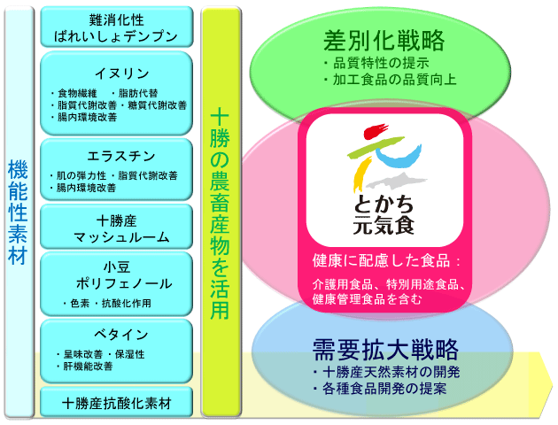 さらに、アグリ・バイオクラスター形成を資するために、「とかち元気食」構想を中心とした、差別化戦略および需要拡大戦略を進め、地場産業化から全国への発展を目指しています。