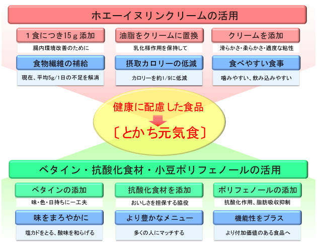 「とかち元気食」のメイン素材には、ABCプロジェクトで開発された「ホエーイヌリンクリーム」など機能性素材を活用した食品があります。