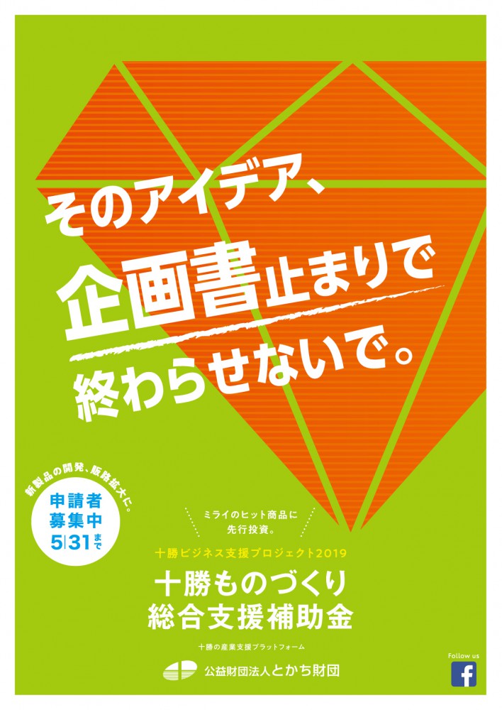 とかち財団では、地域産業の担い手を通じた創業・起業・事業創発の促進による地域産業活性化を図るため「十勝ビジネス支援プロジェクト2019」を実施します。当プロジェクトの第3弾として、「十勝ものづくり総合支援補助金」の公募受付を開始します。