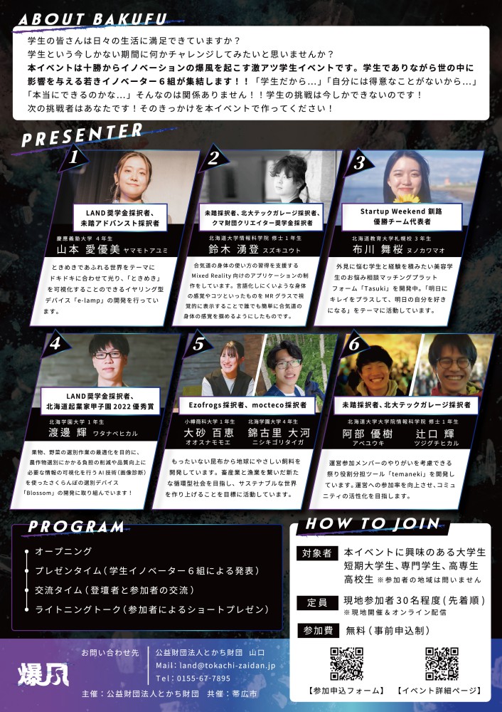 本イベントは十勝からイノベーションの爆風を起こす激アツ学生イベントです。学生でありながら世の中に影響を与える若きイノベーター6組が集結します!