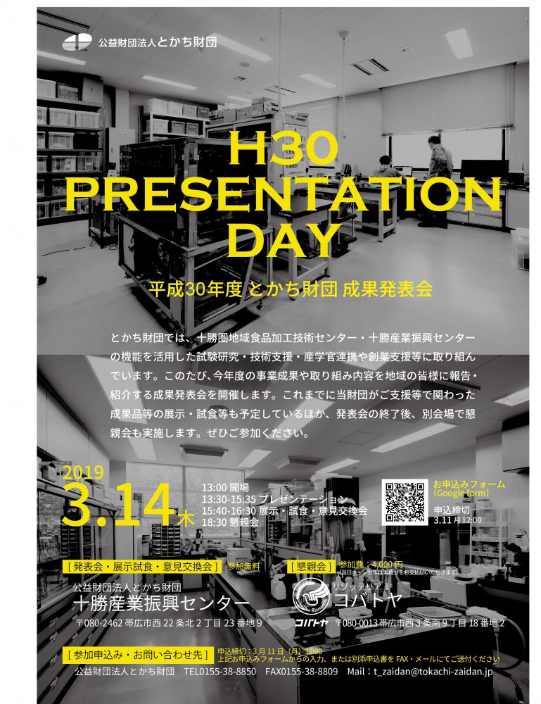 とかち財団は、平成30年度の事業成果や取り組み内容を地域の皆様に報告・紹介する「H30 PRESENTATION DAY 平成30年度とかち財団 成果発表会」を平成31年3月14日に開催します。