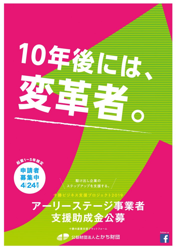 とかち財団では、地域産業の担い手を通じた創業・起業・事業創発の促進による地域産業活性化を図るため「十勝ビジネス支援プロジェクト2019」を実施します。当プロジェクトの第1弾として、「アーリーステージ事業者支援 助成金公募」の応募受付を開始します。