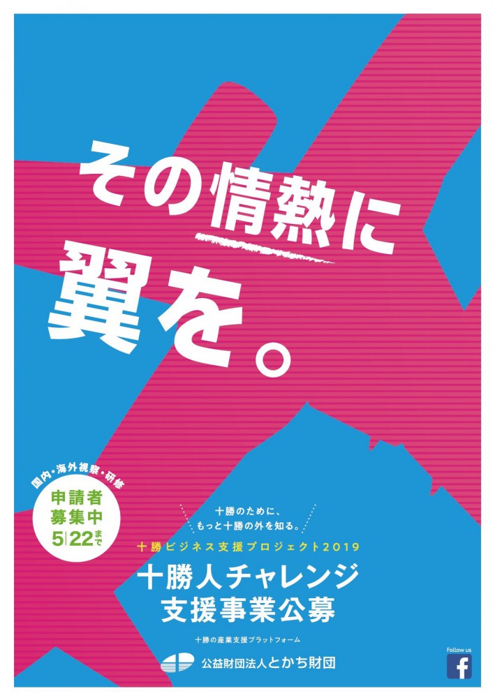 とかち財団では、地域産業の担い手を通じた創業・起業・事業創発の促進による地域産業活性化を図るため「十勝ビジネス支援プロジェクト2019」を実施します。当プロジェクトの第4弾として、「十勝人チャレンジ支援事業」の公募受付を開始します。