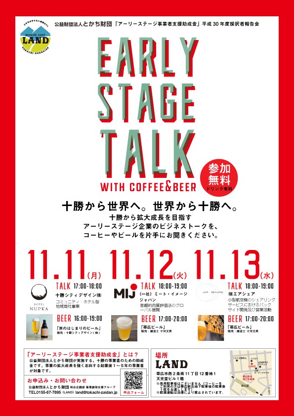 とかち財団が実施する、起業初期段階の事業者を対象とした助成金事業「アーリーステージ事業者支援」の平成30年度採択3社の報告会を下記の通り実施いたします。