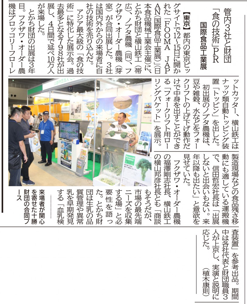 メディア掲載 2018-06-217779 「管内3社と財団『食の技術』PR―国際食品工業展―」(十勝毎日新聞) 機械・電子研究開発情報(機械・電子)地域連携十勝毎日新聞FOOMA機械・電子注目企業振興注目食品注目