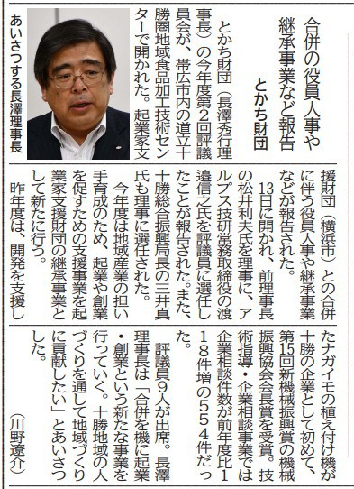 2018年6月13日に開催いたしました、とかち財団の今年度第2回評議員会の記事が十勝毎日新聞(2018.6.26)に掲載されました。