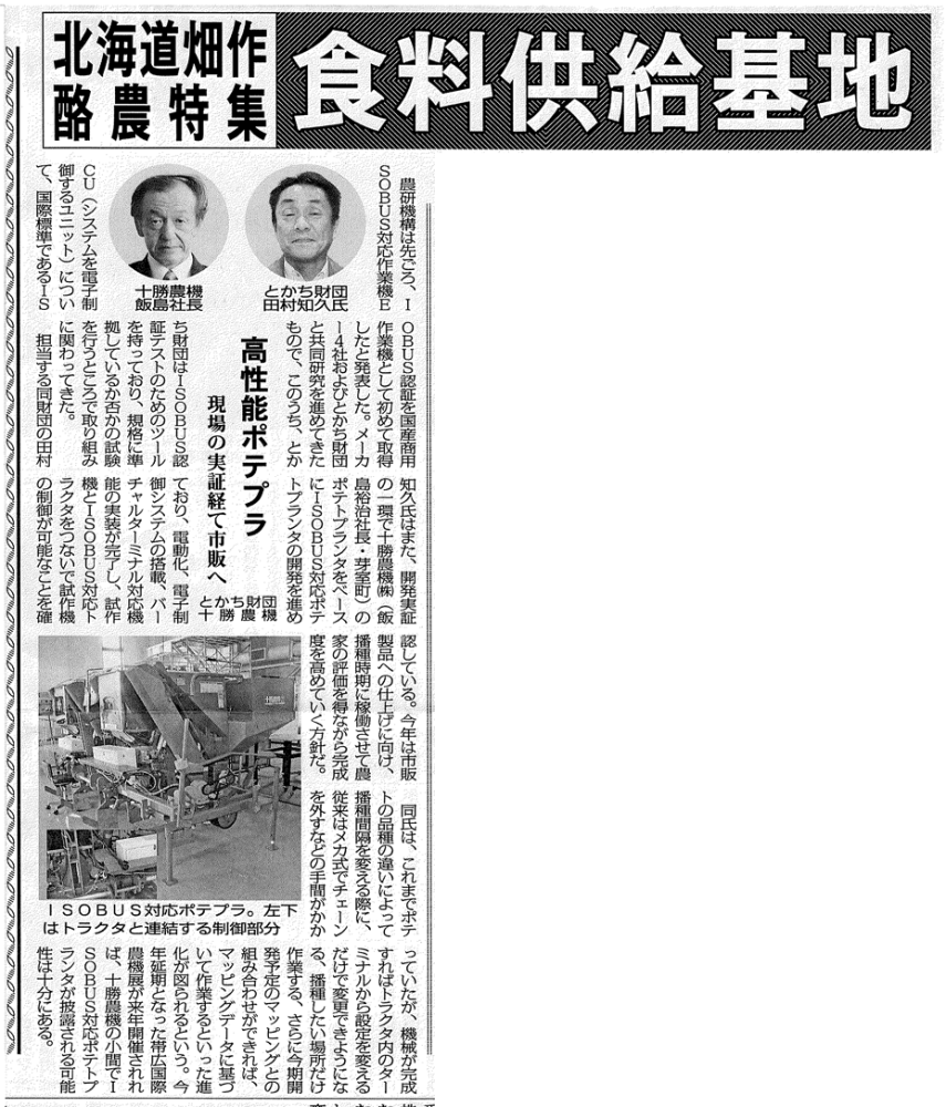 ISOBUS普及推進会(事務局:とかち財団)の、日本国内におけるISOBUS対応機器普及に関する取組みが、農経しんぽう(2022年5月16日)で紹介されました。ISOBUS普及推進会では、随時ご入会を受け付けているほか、ISOBUS対応製品開発に関するお問い合わせやご相談もお受けしておりますので、お気軽にご連絡ください。