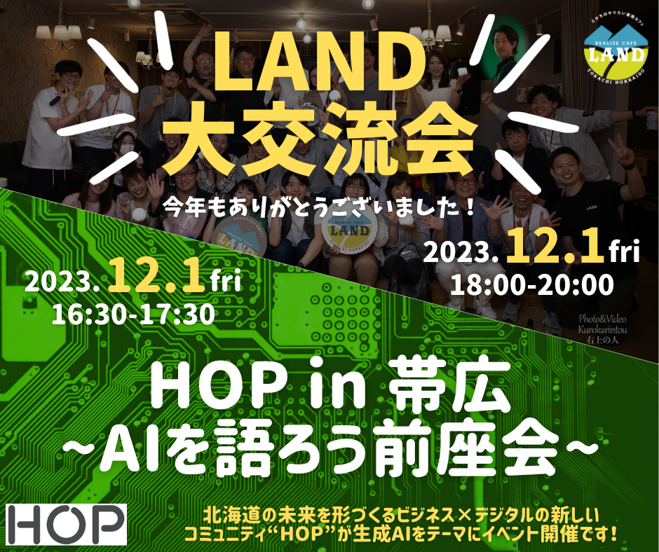 【「LAND大交流会」「HOP in 帯広~AIを語ろう前座会~」の参加については、それぞれ別々に参加申し込みが必要となりますので、ご注意ください。】