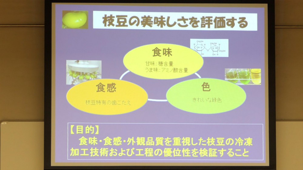 まずは「枝豆の美味しさを科学する」をテーマに、とかち財団の川原が研究結果をご紹介。収穫から加工までの時間経過、加工の際の加熱・冷凍温度の違い等による枝豆の食感、食味、色等、美味しさの違いを検証した内容です。