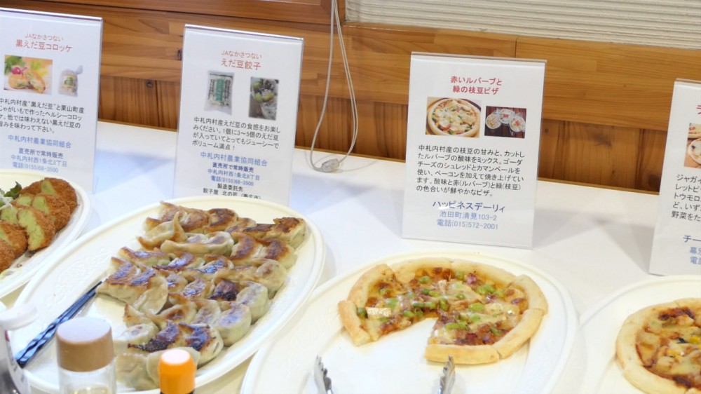 最後に十勝産業振興センター1FのレストランCOREに会場を移し、交流会です。枝豆に関する食が20種類以上! 枝豆餃子、枝豆カレー、枝豆のパン、枝豆プリンに枝豆大福、枝豆焼酎などなど、枝豆づくしの料理を楽しみつつ、参加者同士の交流がおこなわれました。