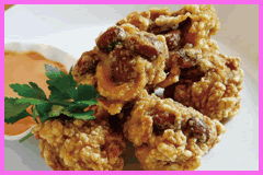 揚げ油が適温になったら、3の金時豆と鶏肉を均等に一口大に丸めて揚げます。 |
