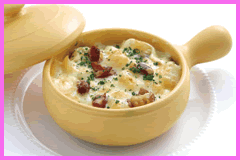 鍋にバターを入れ、ニンニクをかるく炒めます。次に玉葱を加え、色を付けないように炒め、さらにポテトを入れて炒めます。 |
