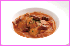 | 1. | 豆風味トマトソースを作ります。 (ア)トマトは湯むきして皮と種を取り除き、粗めに切ってミキサーに入れます。金時豆と水を加えて撹拌します。 (イ)ベーコンは短冊に、玉葱はスライスします。 (ウ)鍋にサラダ油を入れて、ニンニクを炒めます。さらにベーコン・玉葱の順に加えて炒めます。 (エ)次に(ア)を加えて、スープの素・ローリエを入れて、少し煮込みます。 |