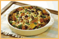 | 4. | 白いんげん豆、金時豆、さやいんげん豆、かぼちゃ、1cm角に切ったハムをグラタン皿に入れ、2を注ぎ、砕いたクルミを表面に散らす。 |