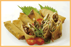 | 4. | 天ぷら鍋6割のサラダ油に、ゴマ油15mlも入れて熱し、春巻を揚げる。きつね色になったら取り出す。 |