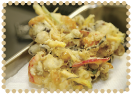 | 5. | 180℃に熱した油におたまですくって入れ、カラッと揚げる。器にご飯を盛ってからかき揚げを盛り、仕上げにわさびを溶き入れて熱々に温めたタレをかける。 |