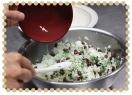 | 4. | 酢飯の中に水気を切ったあずきと大根の葉を加え、味付油揚げに詰めて出来上がり。 |