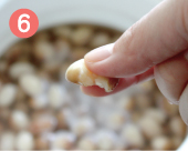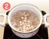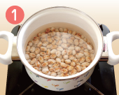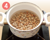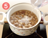 | 豆を鍋に戻し、新たに豆が十分かぶるくらいに水をたっぷりと加え、今度は中火にかけます。 | 煮立ってきたら、差し水をして温度を下げます。再び煮立ってきたら火を弱めてフタをし、煮ます。 | 豆が指先でつまんでつぶれるくらい柔らかくなったらゆで上がりです。ゆで時間は豆の種類によりますが小粒で30〜40分、大粒で30〜80分位です。 |