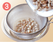 | 鍋はホーロー鍋など厚手で深めのものを用意。浸しておいた水ごと鍋に入れ、水加減は豆の量に対して4〜6倍になるように入れます。 | フタはしないで強火にかけ、沸騰するまで過熱します。 | 煮立ったら、いったん豆をザルに取り、アクを含んだゆで汁を捨てます。 |