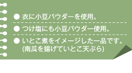 〈1〉 南瓜は食べやすく5mm幅に薄く切る。 〈2〉 じゃがいもは拍子切りにする。 〈3〉 衣は小豆パウダー ・小麦粉・水をさっくり混ぜておく。 〈4〉 南瓜を3.の衣にくぐらせ揚げる。 〈5〉 残った衣にじゃがいも・塩昆布・枝豆を入れ軽くまぜあわせ、かき揚の要領で揚げる。 〈6〉 小豆パウダーと食塩を混ぜ、添える。