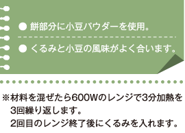 〈1〉 くるみは電子レンジ(600W)で1分加熱し、ほぐしておく。 〈2〉 耐熱の容器に上新粉・白玉粉・小豆パウダー・水を入れよく混ぜる。 〈3〉 2.を電子レンジで3分加熱する。(1回目) 〈4〉 3.を取り出し、ヘラでよく混ぜる。 〈5〉 4.を電子レンジで3分加熱する。(2回目)。 〈6〉 5.を取り出し、1.のくるみを加えよく混ぜる。 〈7〉 6.を電子レンジで3分加熱する。(3回目) 〈8〉 7.を取り出し、ヘラでよく混ぜる。 〈9〉 8.をバットに広げあら熱を取る。 〈10〉 9.が冷めたら全体的に片栗粉をまぶし食べやすい大きさに切る。