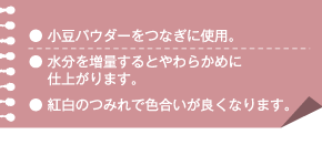 | レシピ提供 坂本寿代様 〈すり身の結着補強〉 〈色調付与〉 〈食物繊維増(つみれのみ:0→1.8%)〉 |