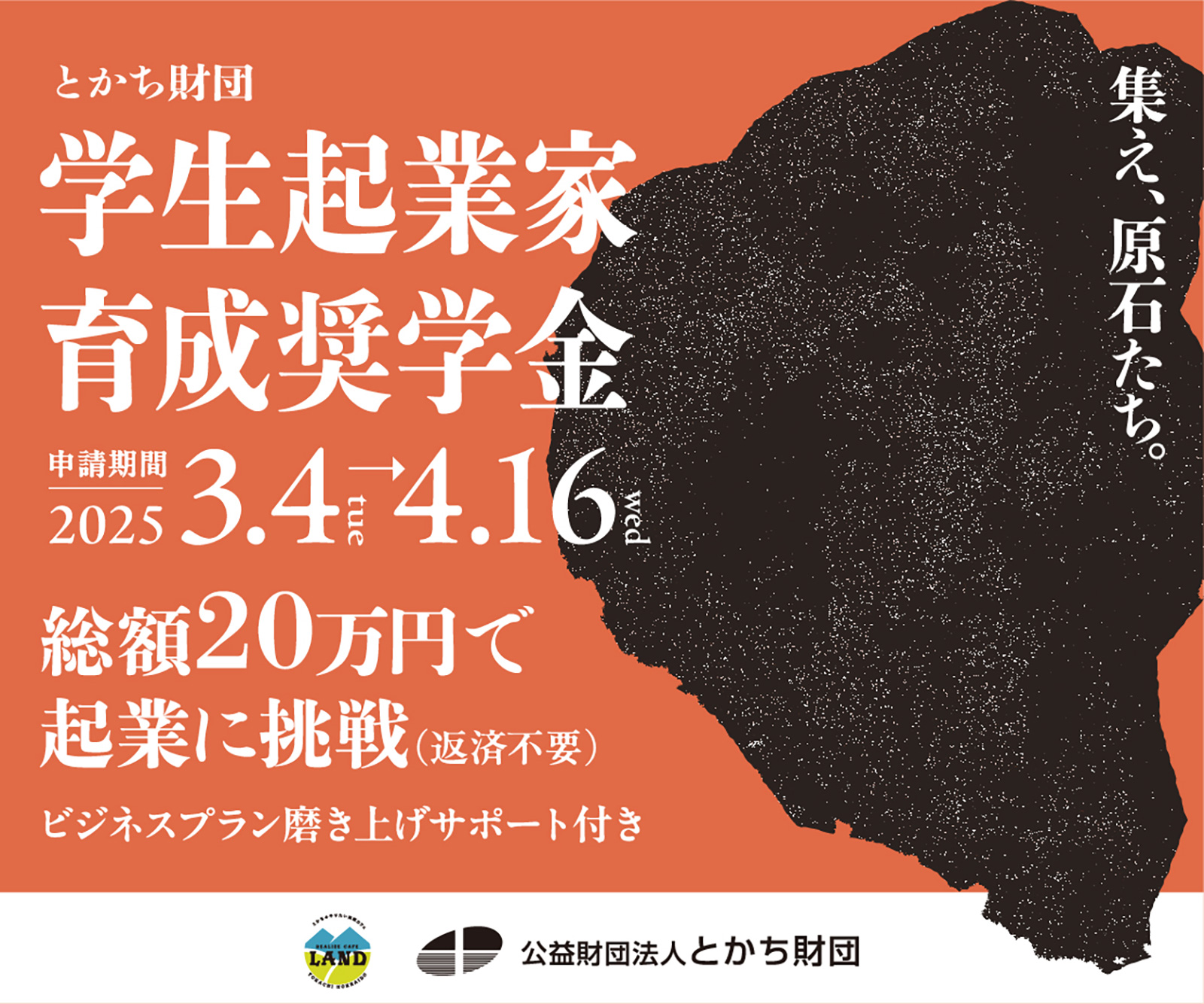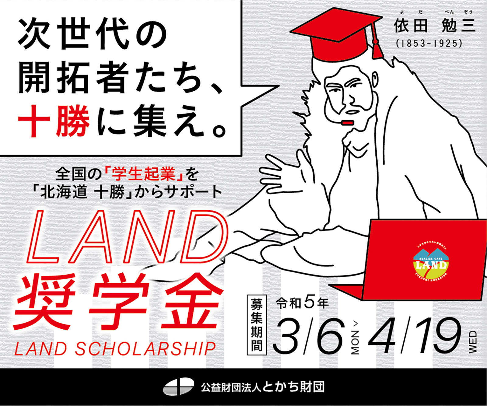 その他 2025-03-041 【申請書類】様式1.2(閲覧用)ZIPファイル その他 2025-03-041 【申請書類】様式1.2(記載用)ZIPファイル 関連トピックス 表示 カテゴリ お知らせ16 メディア掲載1 更新情報0 その他5 キーワード 食品技術0 研究開発情報(食品技術)0 セミナー・人材育成(食品技術)0 情報技術0 研究開発情報(情報技術)0 セミナー・人材育成(情報技術)0 十勝ブランド0 事業創発7 起業創業9 セミナー・人材育成(事業創発)0 十勝毎日新聞1 北海道新聞0 日本農業新聞0 日本経済新聞0 アーカイブ 2025年12月0 2025年11月0 2025年10月0 2025年09月0 2025年08月0 お知らせ 2025-07-021396 令和7年度とかち財団学生起業家育成奨学金の採択者が決定しました! その他 2025-03-041 【リーフレット】令和7年度とかち財団学生起業家育成奨学金(LAND奨学金) その他 2025-03-041 【公募要領】令和7年度とかち財団学生起業家育成奨学金(LAND奨学金) その他 2025-03-041845 令和7年度とかち財団学生起業家育成奨学金説明動画 その他 2025-03-041 【申請書類】様式1.2(閲覧用)ZIPファイル その他 2025-03-041 【申請書類】様式1.2(記載用)ZIPファイル お知らせ 2024-07-123400 令和6年度とかち財団学生起業家育成奨学金の採択者が決定しました! お知らせ 2024-03-044187 令和6年度「とかち財団学生起業家育成奨学金(LAND奨学金)」公募開始のお知らせ お知らせ 2023-10-314208 令和5年度LAND奨学金活動報告会「Presentation Day」を実施いたします!(2023/11/25開催) お知らせ 2023-07-015681 令和5年度LAND奨学金の採択者が決定しました! #事業創発注目 #起業創業 #LAND奨学金 お知らせ 2023-03-065114 R5年度「LAND奨学金」公募開始のお知らせ #起業創業 #LAND奨学金 お知らせ 2022-11-252340 令和4年度LAND奨学金最終報告会を実施いたします!(11/26実施) 関連トピックス とかち財団アーリーステージ事業者支援 お問合せ先 公益財団法人とかち財団 総合企画部 事業創発支援グループ 〒080-0012 帯広市西2条南11丁目12番地1天光堂ビル1階(LAND)電話:0155-67-7895/メール:student@tokachi-zaidan.jp