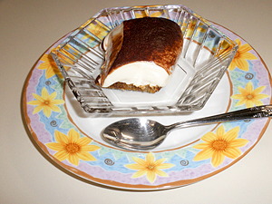 - 盛り付ける前にココアを表面にふりかける。スプーンですくい取り分けて出来上がり。