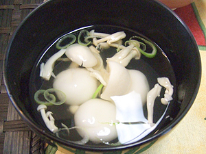 - だし汁に塩・醤油・えのき茸を加え、一煮立ちさせたら、2と千切りした長ネギを加える。