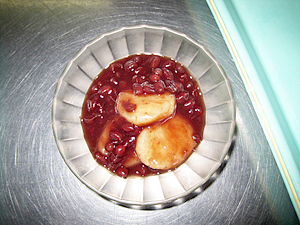 - 蒸しあがったいも団子を、ぜんざいに入れる。