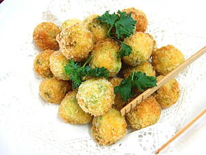 - 直径2cm程度に丸め、薄力粉・溶き卵・パン粉の順に付け、コロッケ種を作る。