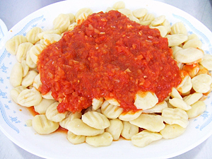 ニョッキが浮いてきたら鍋から引き上げ、水気を切る。 - お好みのソースをかけて出来上がり。