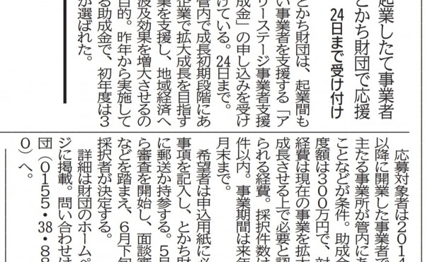 メディア掲載 2019-04-038947 「起業したて事業者 とかち財団で応援-24日まで受け付け-」メディア掲載(十勝毎日新聞) #十勝毎日新聞 #起業創業 #アーリーステージ事業者支援 #事業創発注目
