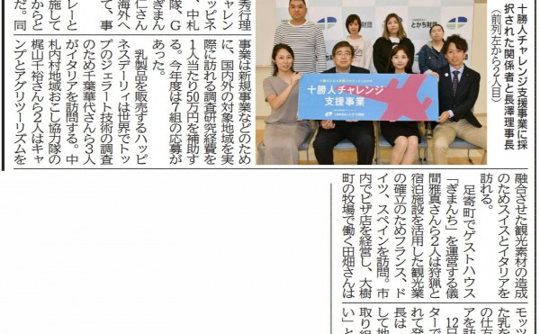 メディア掲載 2019-08-1311135 「十勝人チャレンジ支援事業 1期生が海外報告」メディア掲載情報 #十勝人チャレンジ支援事業 #十勝ビジネス支援プロジェクト #事業創発 #起業創業 #地域連携 #セミナー・人材育成(起業創業) #十勝毎日新聞 #事業創発注目