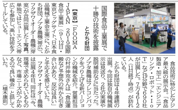 メディア掲載 2019-07-177138 「国際食品工業展で十勝の技術を披露ーとかち財団ー」メディア掲載情報(十勝毎日新聞) #FOOMA #機械・電子 #研究開発情報(機械・電子) #セミナー・人材育成(機械・電子) #地域連携 #十勝毎日新聞