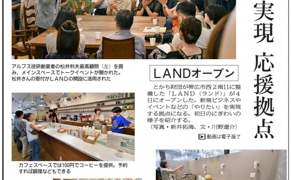 メディア掲載 2019-08-137439 「『やりたい』実現の場 -とかち財団創業拠点『LAND』開所」メディア掲載情報 #LAND #事業創発 #起業創業 #地域連携 #セミナー・人材育成(起業創業) #十勝毎日新聞 #企業振興注目