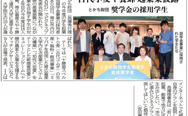 メディア掲載 2019-08-139924 「古代小麦や養蜂 起業案披露ーとかち財団 奨学金の採用学生」メディア掲載情報 #学生起業家育成奨学金 #十勝ビジネス支援プロジェクト #事業創発 #セミナー・人材育成(起業創業) #起業創業 #十勝毎日新聞 #事業創発注目