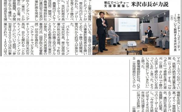 メディア掲載 2019-09-037179 「『挑戦の絶対量、質を凌駕』帯広でベンチャー支援事業催し -米沢市長が力説」メディア掲載情報 #事業創発 #起業創業 #セミナー・人材育成(起業創業) #LAND #十勝毎日新聞 #事業創発注目