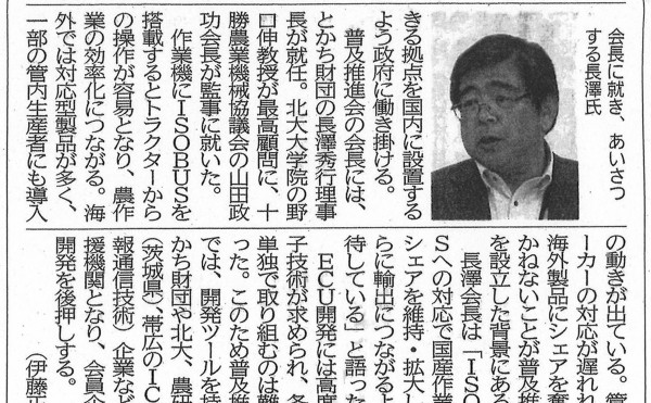 お知らせ 2018-08-139182 「ISOBUS普及推進会 設立総会」メディア掲載記事(日本農業新聞、十勝毎日新聞) #機械・電子 #研究開発情報(機械・電子) #地域連携 #日本農業新聞 #十勝毎日新聞 #ISOBUS #理事長 #機械・電子注目