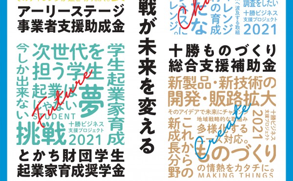お知らせ 2021-03-057036 「十勝ビジネス支援プロジェクト2021」公募開始について #十勝ビジネス支援プロジェクト #とかち財団学生起業家育成奨学金 #十勝人チャレンジ支援事業補助金 #アーリーステージ事業者支援助成金 #十勝ものづくり総合支援補助金 #食品セミナー・人材育成(食品) #機械・電子セミナー・人材育成(機械・電子) #起業創業セミナー・人材育成(起業創業) #事業創発注目 #食品注目 #機械・電子注目 #企業振興注目